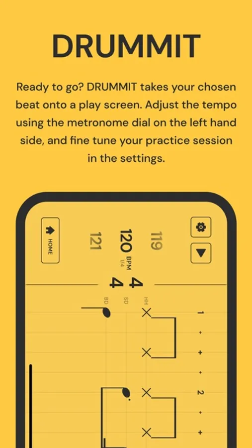 DRUMMIT: Ready to go? DRUMMIT takes your chosen beat onto a play screen. Adjust the tempo using the metronome dial on the left hand side, and fine tune your practice session by going to SETTINGS.
