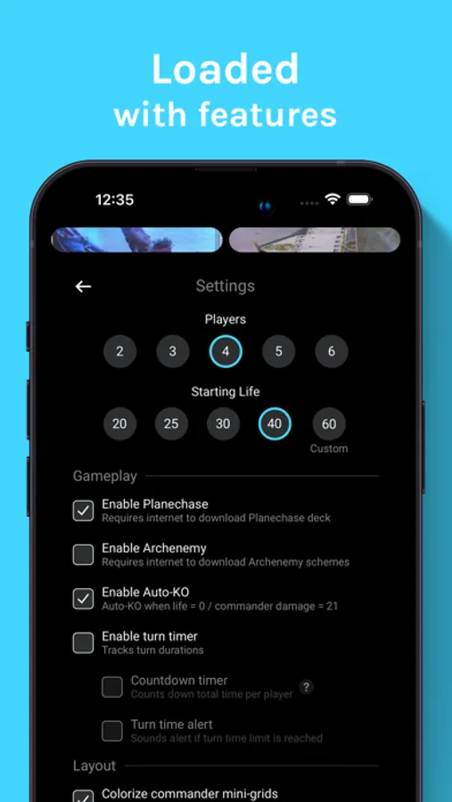 - Supports 2 to 6 players, AND includes a One-player mode that still tracks incoming commander damage and counters (Infect, Experience, etc)