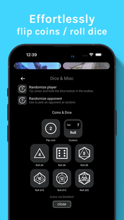 - A dice roller that can randomly pick a player, an opponent, and roll one of many dices - or flip a coin