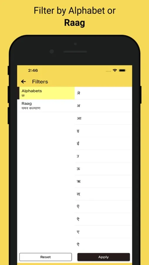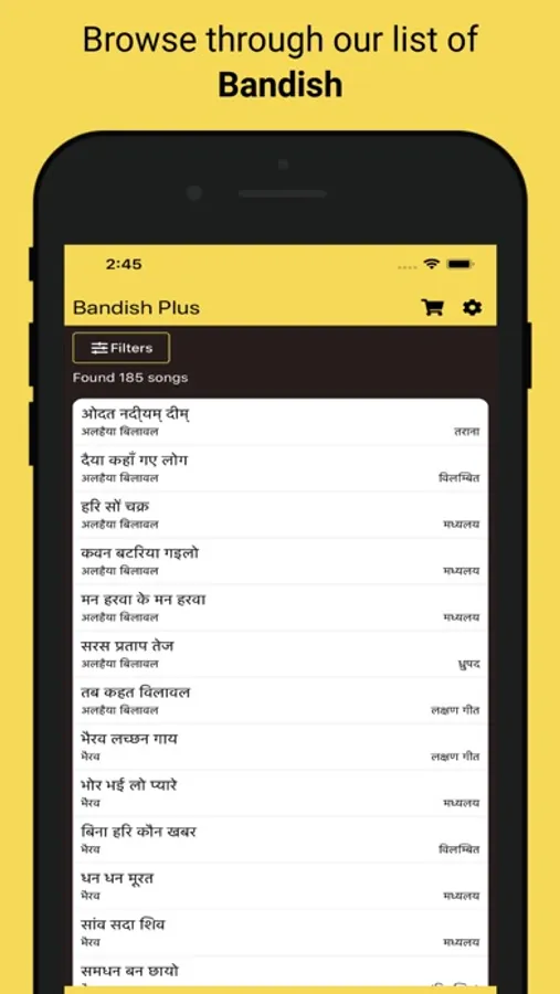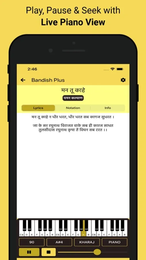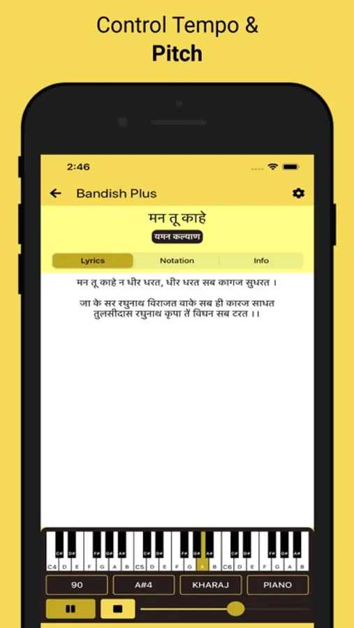 Unlike any book, where you can view only the notations. In Bandish Plus, you get the lyrics, notations and the ability to playback the notes on your desired scale and tempo.