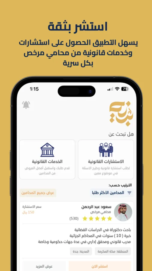 انضم إلى مجتمعنا من الأفراد الذين يقدرون الراحة والخبرة والخدمات القانونية بأسعار معقولة. قم بتنزيل تطبيقنا اليوم وخذ السيطرة على رحلتك القانونية بثقة.