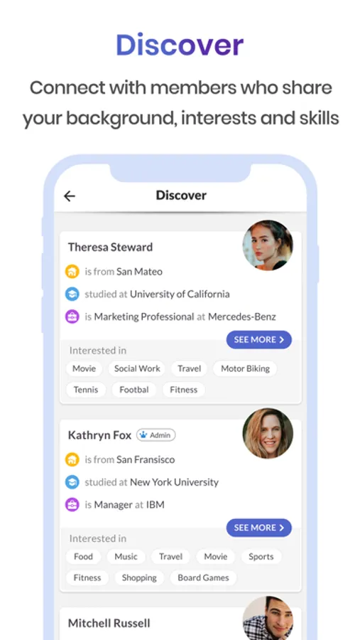 • Easily search for members by name, location, college, company, profession, hometown, etc.