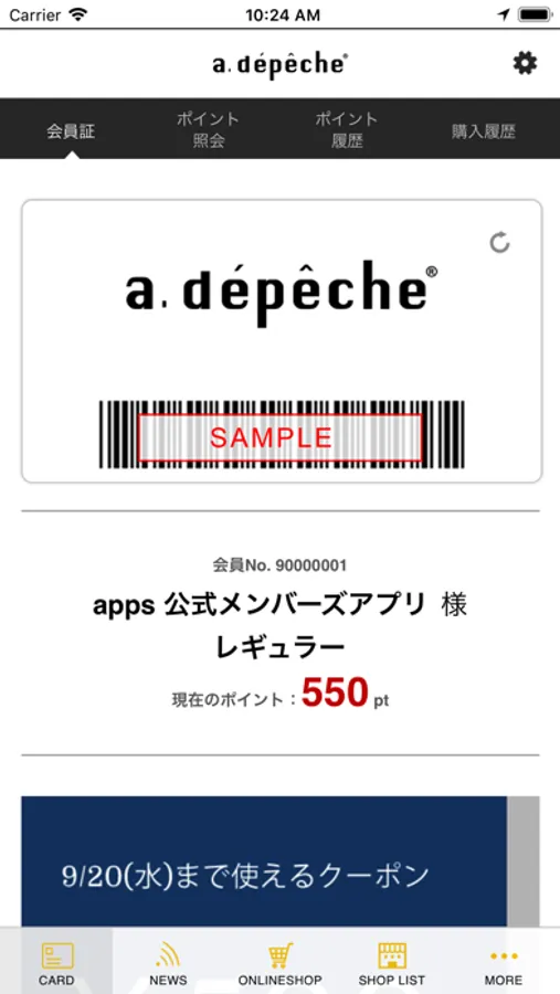 「a.depeche」アプリは、対象店舗にて会員証としてご利用いただけるだけでなく、最新のお知らせや、オンラインショップでのお買いものが便利にご利用いただけるアプリです。