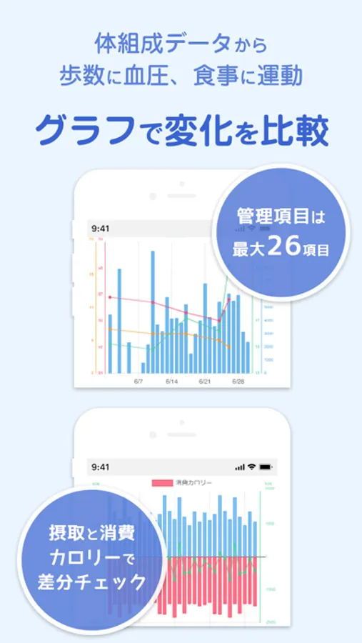 毎日の測定データをグラフにすることで、からだの状態の変化が一目で確認できるなど、日々の健康管理にお役立ていただける機能が豊富。
