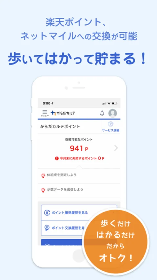 楽天ポイントやネットマイルポイントに変換できる「からだカルテポイント」がゲットできます。
