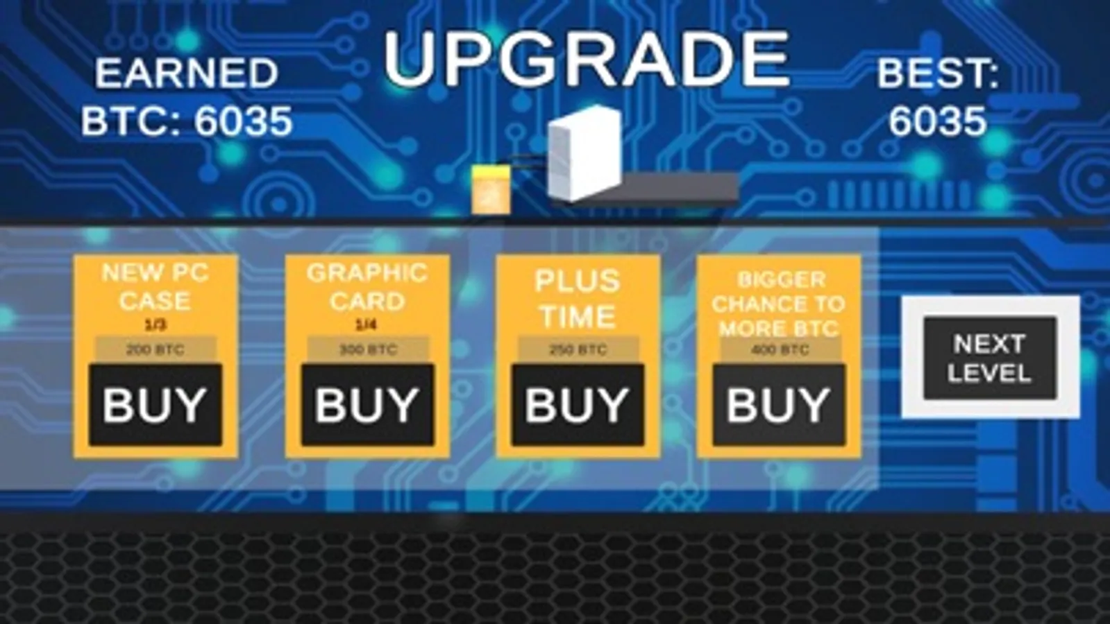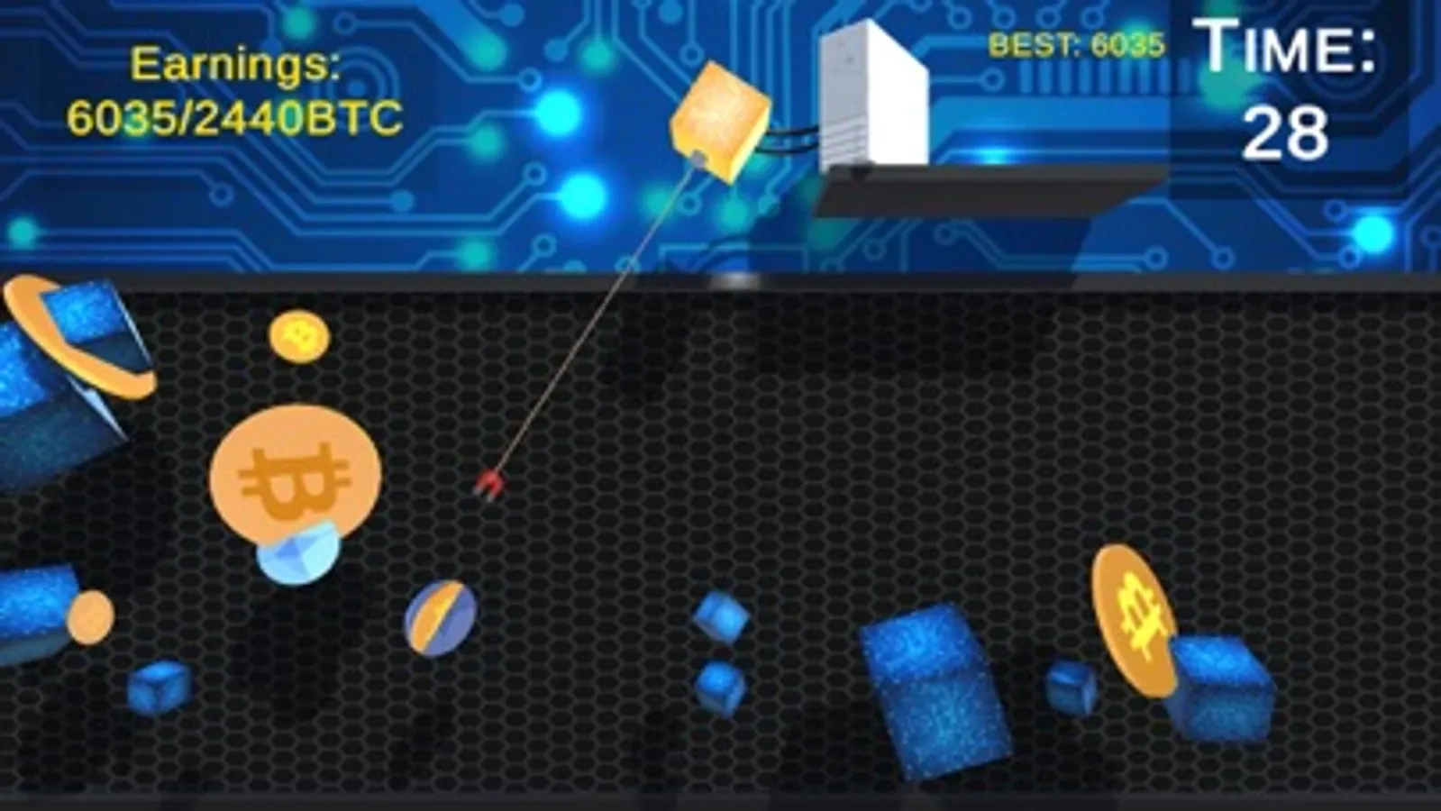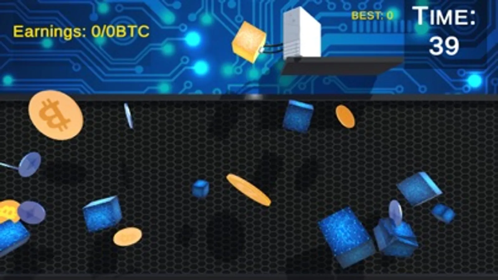 Collect the target amount of crypto assets by the end of the stage. If you don't meet your goal by the end of the level you need to start over and all your upgrade will lose.