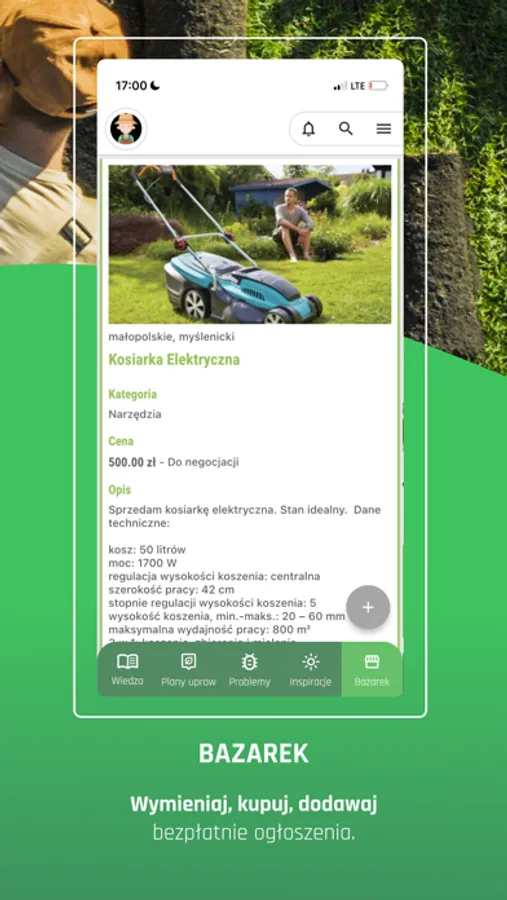 W aplikacji znajdziesz też miejsce przypominające targ roślinny. Bazarek to miejsce dla wszystkich, którzy interesują się ogrodnictwem. Tutaj można kupować/sprzedawać, wymieniać się, oddawać/brać za darmo narzędzia, wyposażenie ogrodu i rośliny; gdzie możesz podzielić się nadmiarową liczbą sadzonek i nasion roślin, pozbyć się nieużywanych narzędzi czy nadmiaru nasion. Dodaj też ogłoszenie, jeśli szukasz kogoś kto podaruje/wymieni się/sprzeda Ci wyposażenie do ogrodu, nasiona, sadzonki, zrazy drzew owocowych, doniczki i inne rzeczy potrzebne przy pracach ogrodniczych.