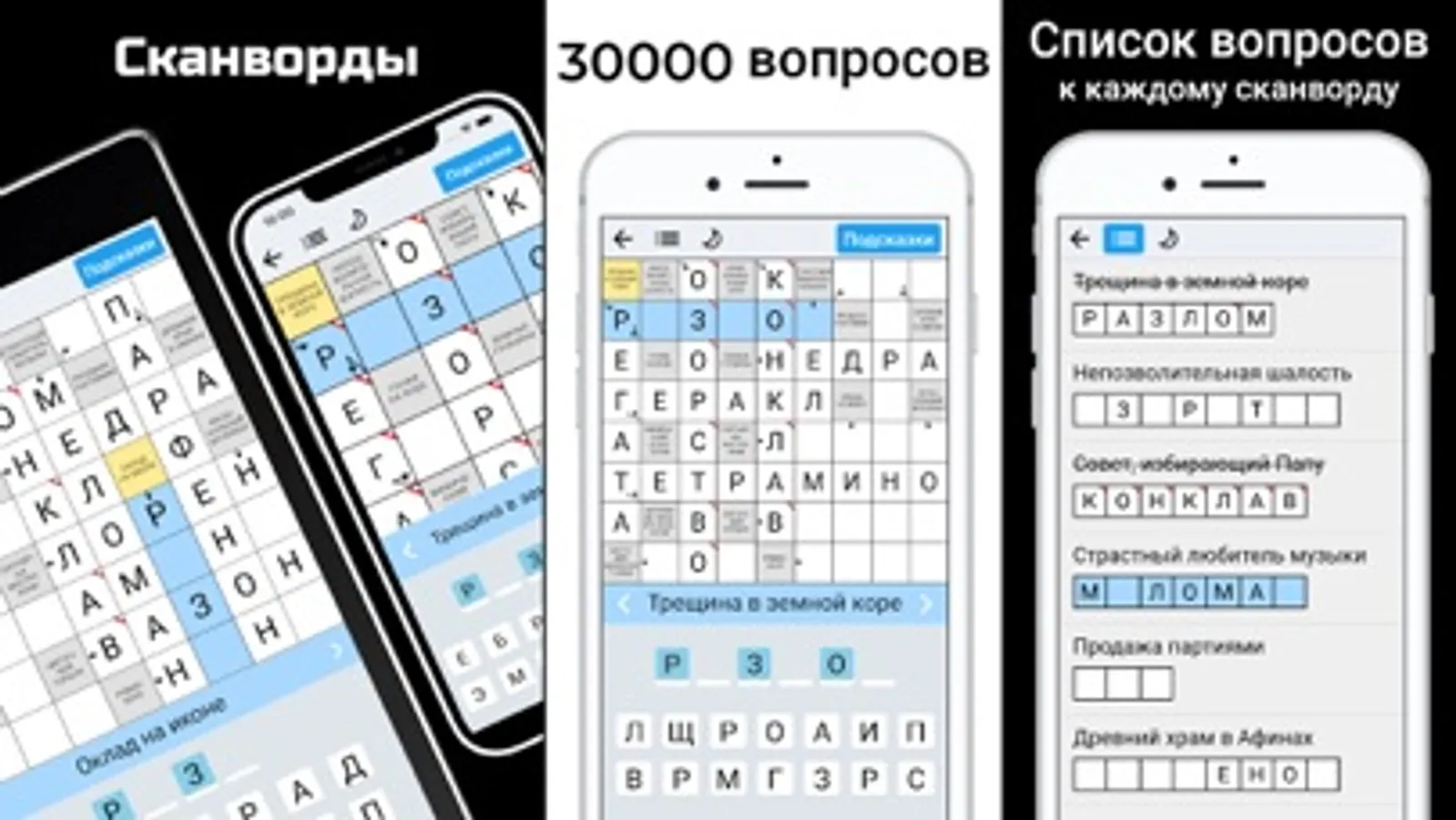 - Более 40000 уникальных вопросов, 3000 сканвордов.
