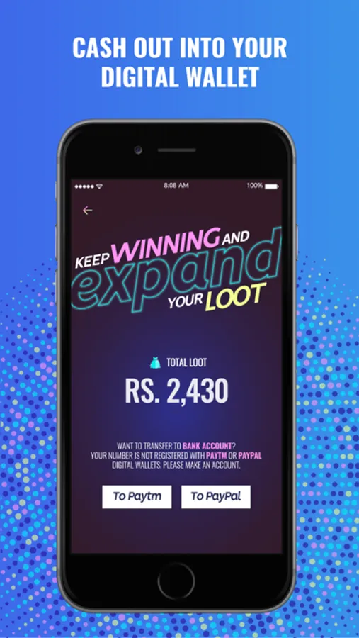 · After a certain number of games, you can cash out to PayTM or PayPal, anytime, however small the amount is.