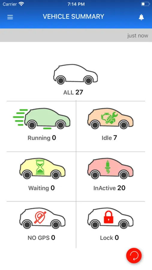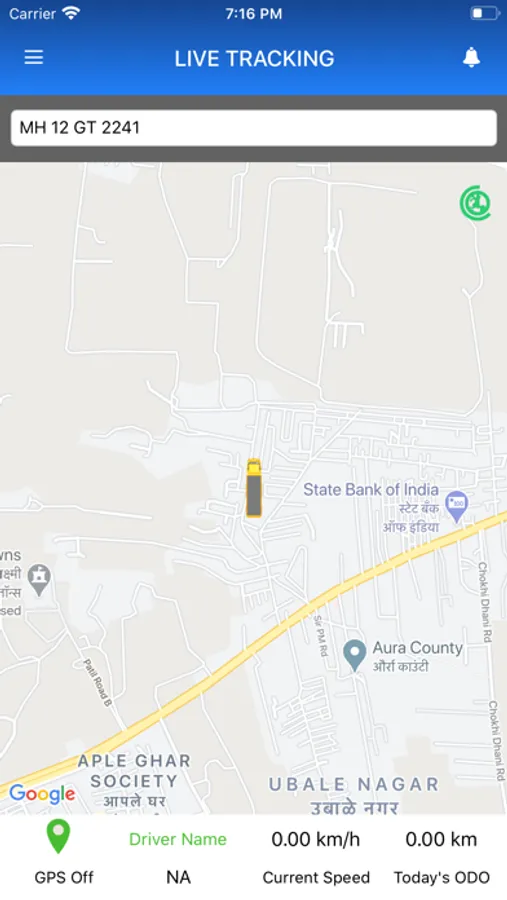 - Vehicle dashboard with GPS signal, Device Battery status, Device PowerCut status, Ignition On/Off status