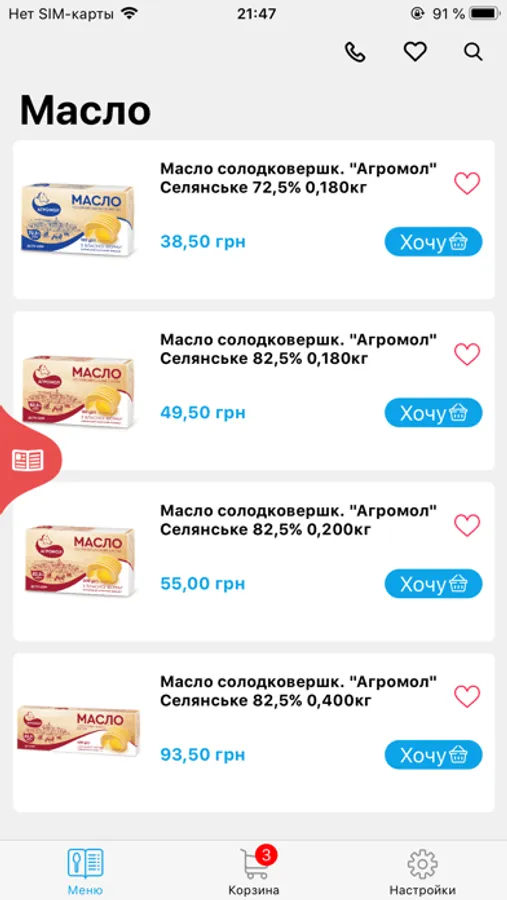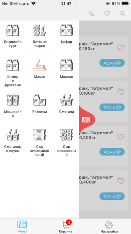 В приложении есть полный перечень продукции Агромол: молоко, сметана, кефир и кефир с фруктами, масло, ряженка, бифидойогурт, сыр кисломолочный и плавленый, соус сметанный, сырок детский, моцарелла. Наша продукция настолько разнообразна, что придется по вкусу любому. Также, каждый продукт комбината Агромол изготавливается из натурального молока и ингредиентов. У нас замкнутый цикл – от заготовки кормов для коров, до доставки клиентам готовых молочных продуктов. Все процессы строго контролируются и соответствуют ГОСТам.