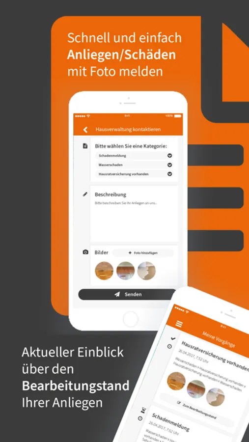 Als Mieter oder Eigentümer können Sie Schäden oder Anliegen direkt mit Fotos über unsere App melden. Ihre Anfragen stehen unseren Mitarbeiten dann zur Verfügung und können auch an Handwerksbetriebe weitergeleitet werden.