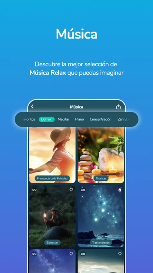Todo esto gracias a las categorías musicales más efectivas y las meditaciones más eficaces distribuidas por secciones:
