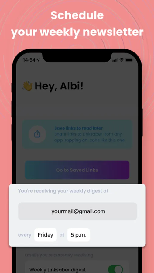 You can also schedule your weekly newsletter for the day and time you prefer, and soon you’ll be able to link your Pocket account, so that you can also receive your Pocket links in your Linksaber newsletter.