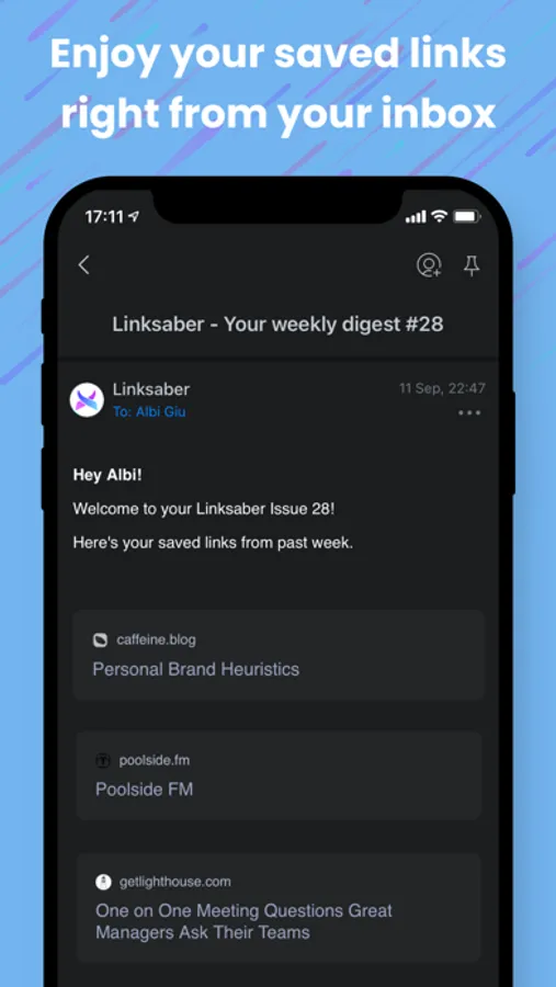 Share links to Linksaber, receive them back in a weekly newsletter, right in your inbox.