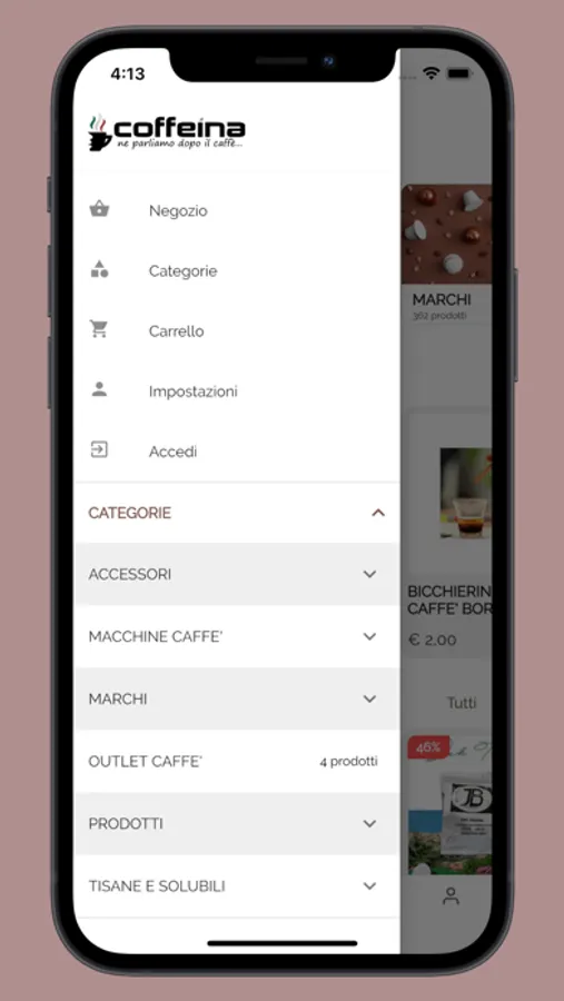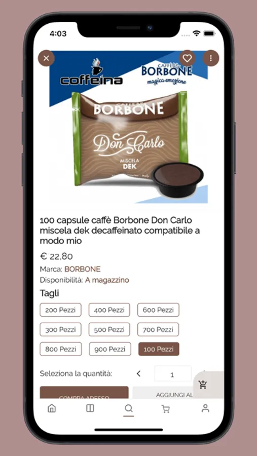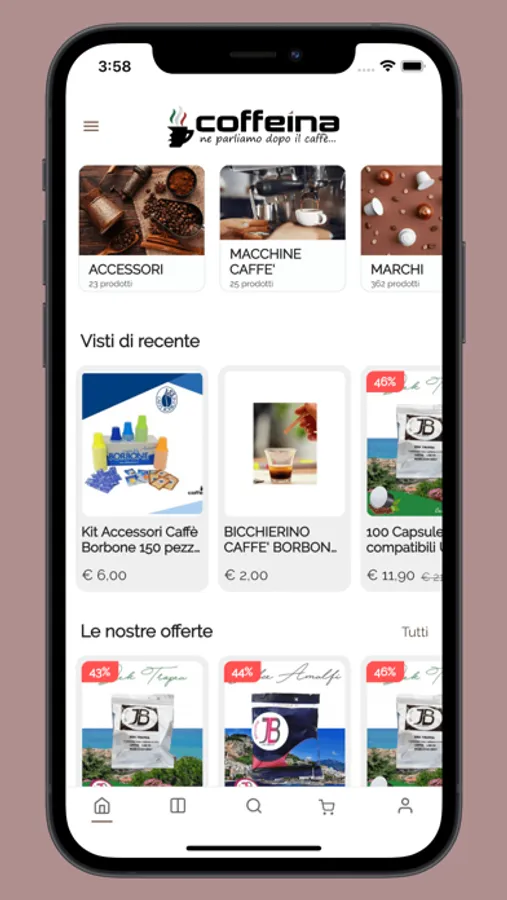 Coffeina.it è il sito di riferimento per l'acquisto di cialde e capsule compatibili delle migliori marche. Con l'app di Coffeina puoi acquistare il tuo caffè preferito direttamente dal tuo dispositivo ovunque ti trovi. Nel nostro catalogo sono presenti capsule compatibili per Nespresso, Nescafé Dolce Gusto, Lavazza A Modo Mio, Lavazza Espresso Point, Bialetti e tante altre. Ricevi direttamente sul tuo dispositivo le nostre promo in anteprima.