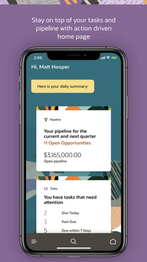 Your new mobile home page is your hub for everything you need to know, and everything you need to do. Intuitive cards hold your daily sales briefing, assigned tasks and key opportunities.