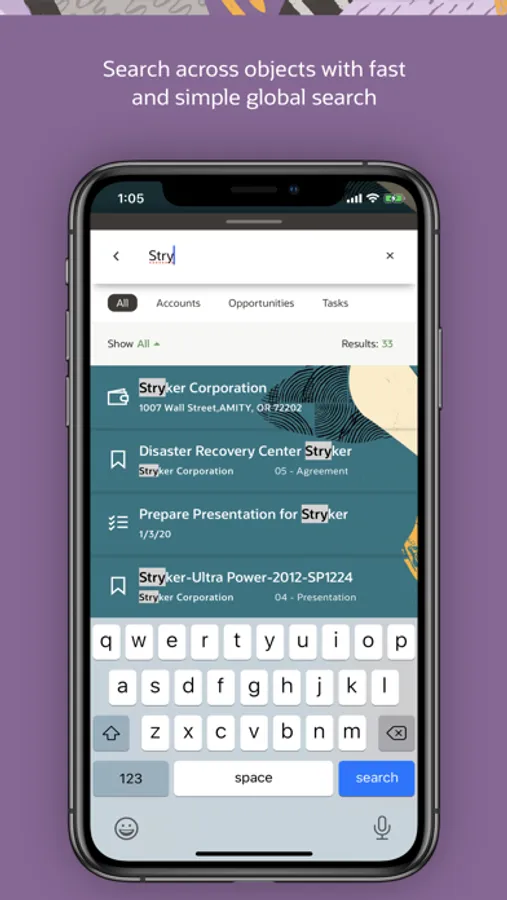 Multi-keyword global search makes finding what you need fast and intuitive with results surfacing as you type. Actionable icons and contextual actions are embedded throughout the app for fast and easy updates to records.