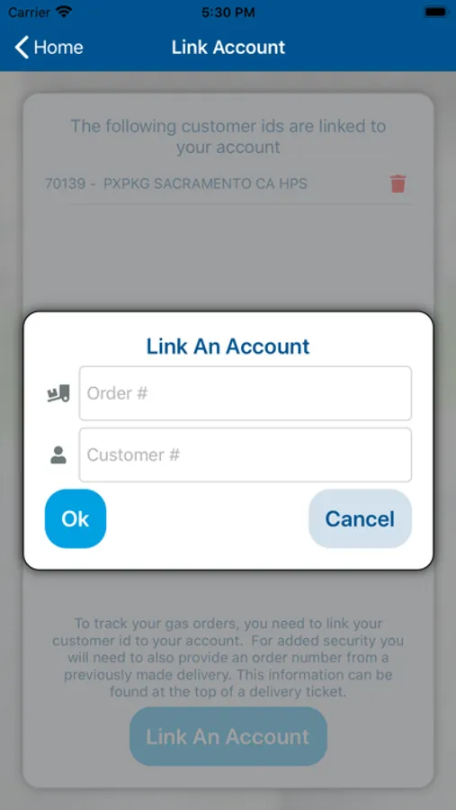GasTracker allows you to quickly see your upcoming cylinder deliveries along with a history of completed deliveries. See the truck’s location*¹ in real time for your current day deliveries. For completed orders, you can easily view and email the order’s delivery ticket*². To get started you will need to create a GasTracker account. Once your account is created, you will need to link your customer id to your account. For security, you will need to find an old delivery ticket and enter the 18-character order number along with 8-digit customer number on the Link Account page of the app.