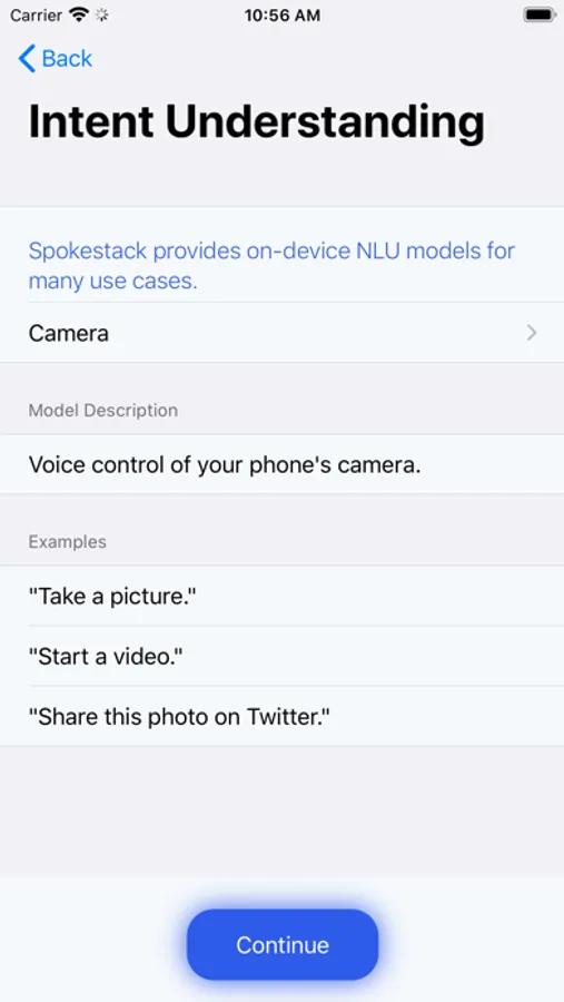 Intent Understanding - Experiment with the basics of natural language processing. Studio lets you load an on-device natural language understanding model to experience how it converts what you say to an intent.