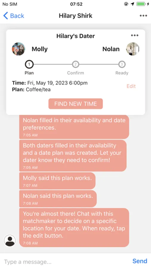 • Using the Date Planner function, Matchmakers message their Dater friend to weigh in on time and location.