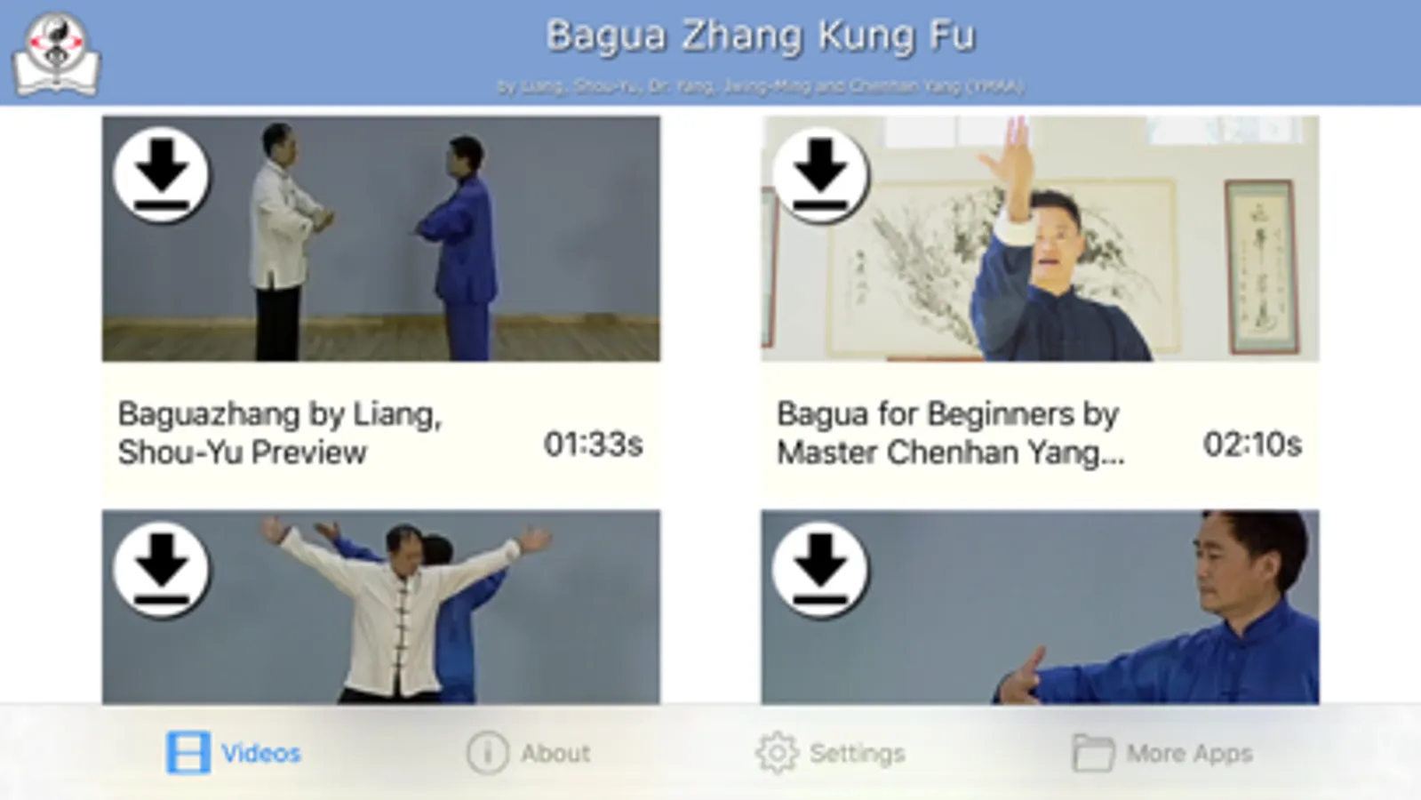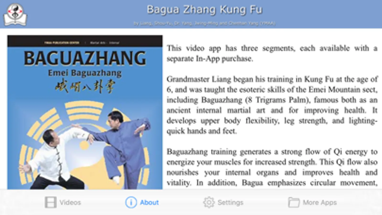 Bagua Zhang Eight Trigrams Kung Fu by Liang, Shou-Yu, Dr. Yang, Jwing-Ming and Chenhan Yang (YMAA). Learn the most popular forms of Bagua with these streaming video lessons, including Eight Palms, Swimming Body, and Deer Hook Sword forms. This video app has three segments, each available with a separate In-App purchase.