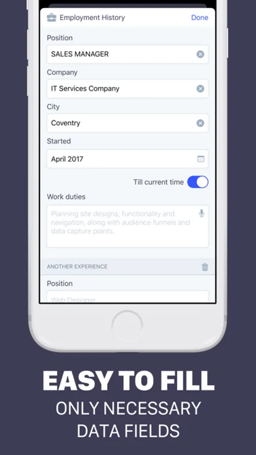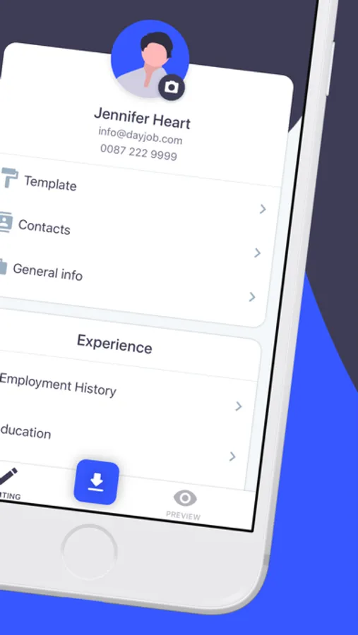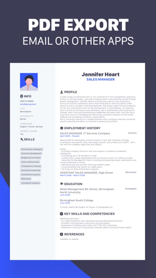HANDY RESUME / CV BUILDER will help you create a professional profile fast and easy. Fill necessary information and check the preview of your resume after every step or even every field. Not in the end of writing.