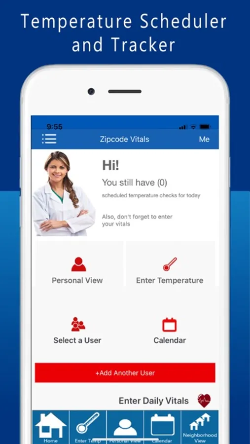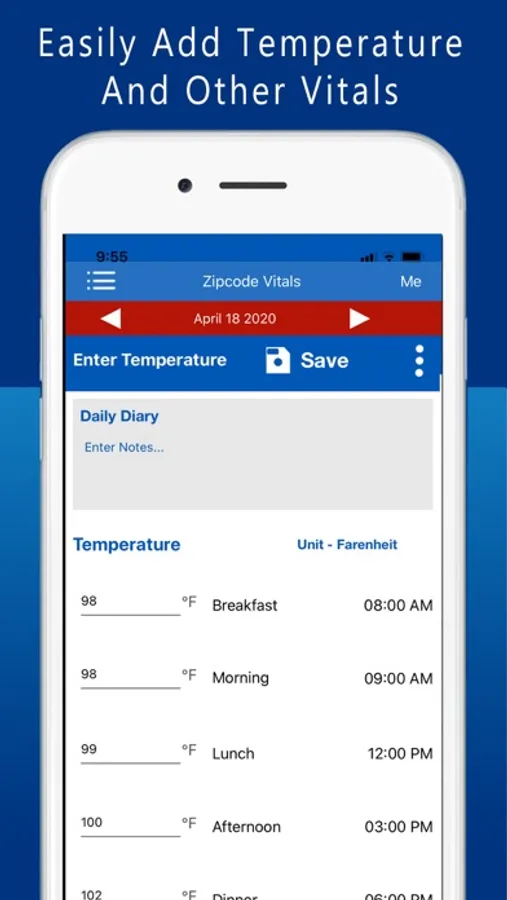 Zipcode Vitals notifies users when it is time to take a temperature reading, vitals, and symptoms status check throughout the day and records the results.