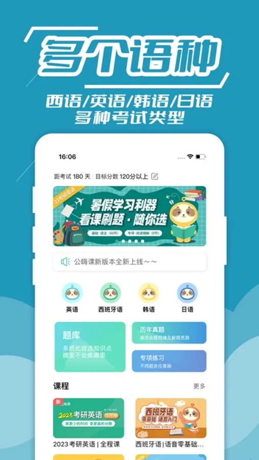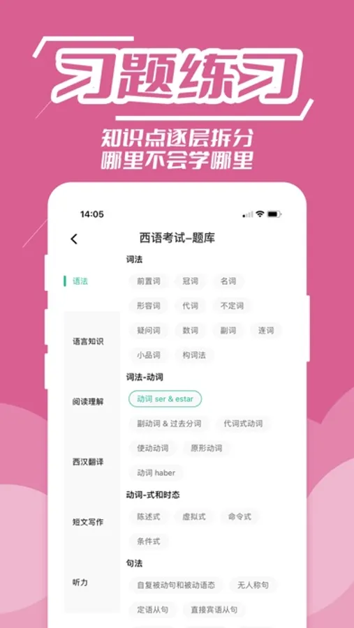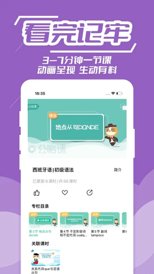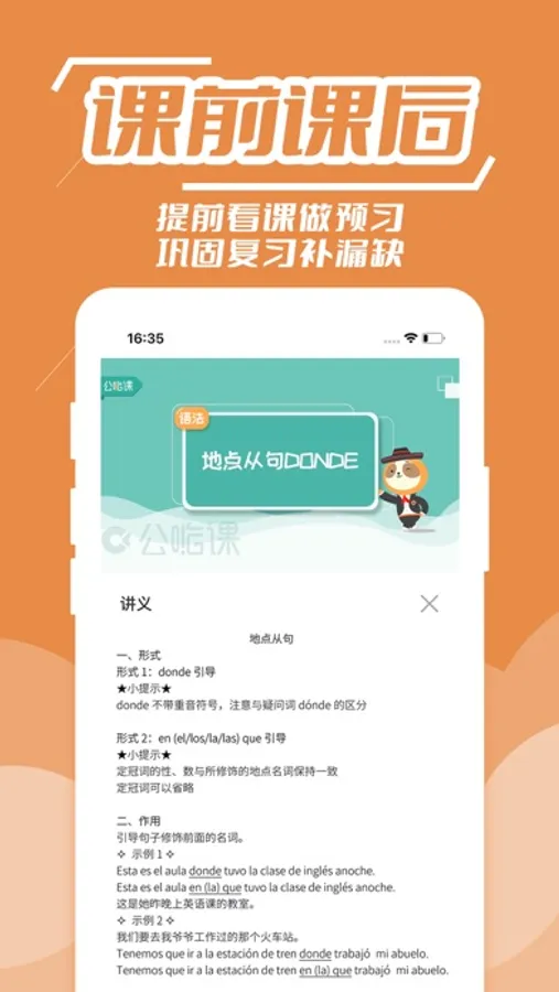 公嗨课-自助学习西班牙语、韩国语、英语、日语的在线平台。每节微课3-7分钟讲透一个知识点,每节微课下配套的讲义用于记笔记,配套的练习题的要点和微课知识点匹配,方便学生自主找到问题并解决问题。此外,题库中的题也可以根据知识点自主选择,自由组合。无论是完成课后作业、总结课堂要点、预习复习基础知识、攻克重点难点,还是阶段性考试、考前冲刺,都可来公嗨课,帮你巩固知识,打牢基础,轻松应对各类考试(西语考试、DELE、SIELE、专四、专八、商务西班牙语资格证、大学英语、CET-4/6、考研英语、TOPIK、JLPT、J-TEST)