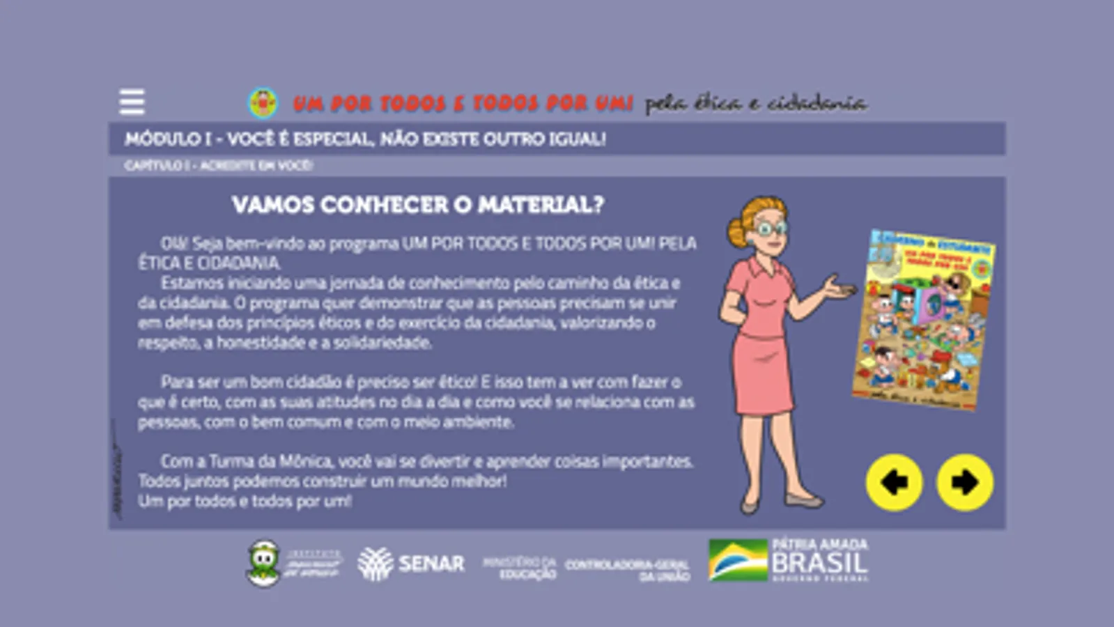 Seja bem-vindo ao Programa Um por todos e todos por um! Pela ética e cidadania. Este aplicativo contém o Caderno do Estudante, material que é utilizado pelas crianças em idade escolar do 1º ao 5º ano do ensino básico.