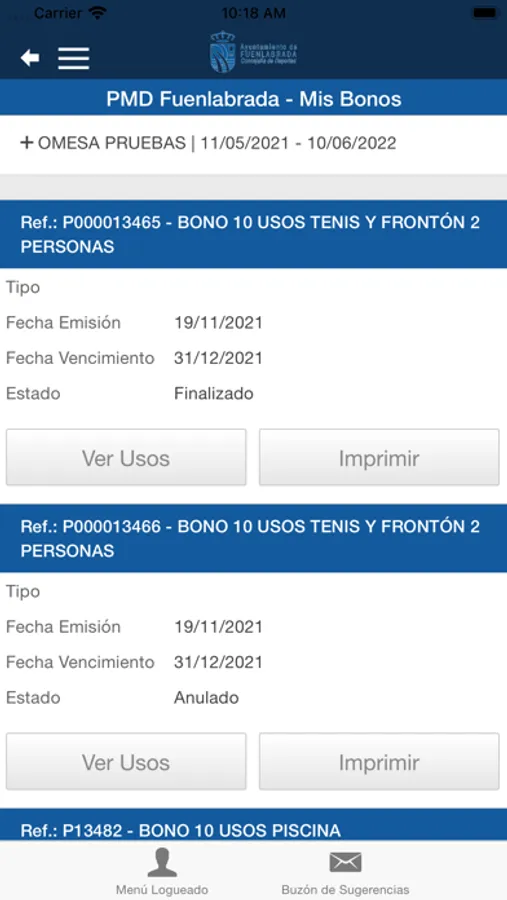 - Bonos adquiridos, con consulta de su estado y detalle de usos