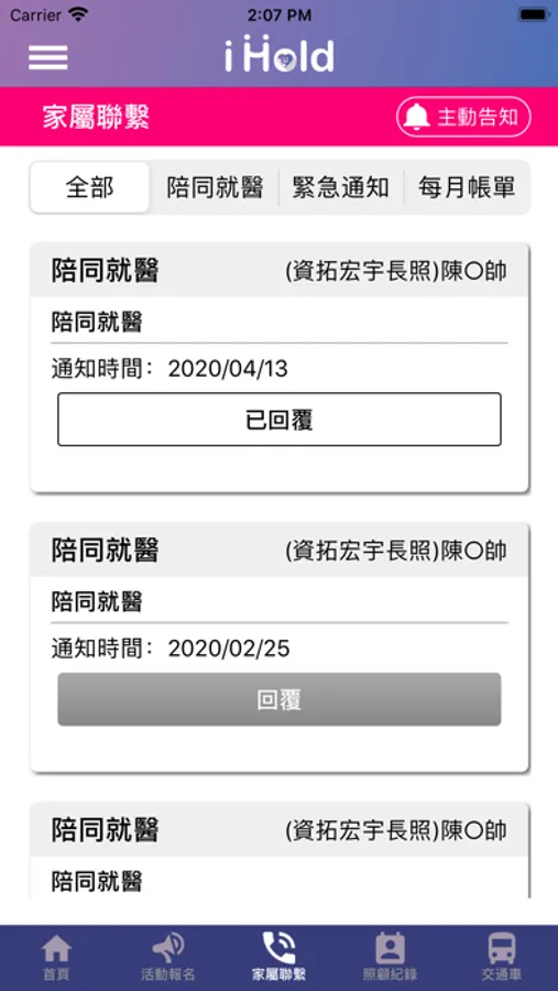 iHold家屬聯絡簿的誕生,是為了提供護理之家、養護機構、日照中心…等照顧單位,一個與個案家屬良善且方便的溝通管道,增加個案家屬與照護單位之間的訊息互動,透過家屬活動報名、緊急聯繫通知、陪同就醫邀約、每月帳單遞送、照護摘要傳遞、最新消息佈達、活動相簿、滿意度調查、交通車預約與異動…等互動服務,以達到家庭互動共同照顧的理想境界。