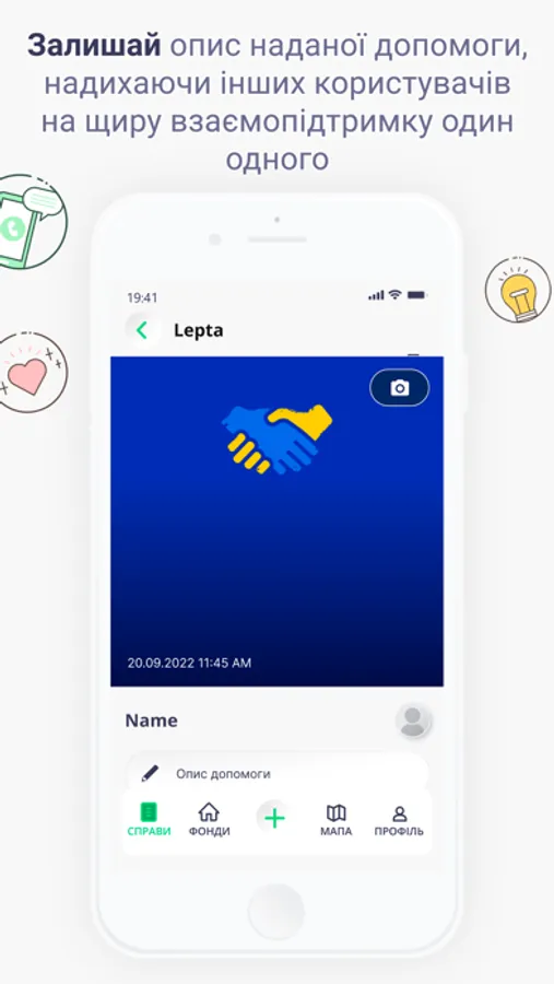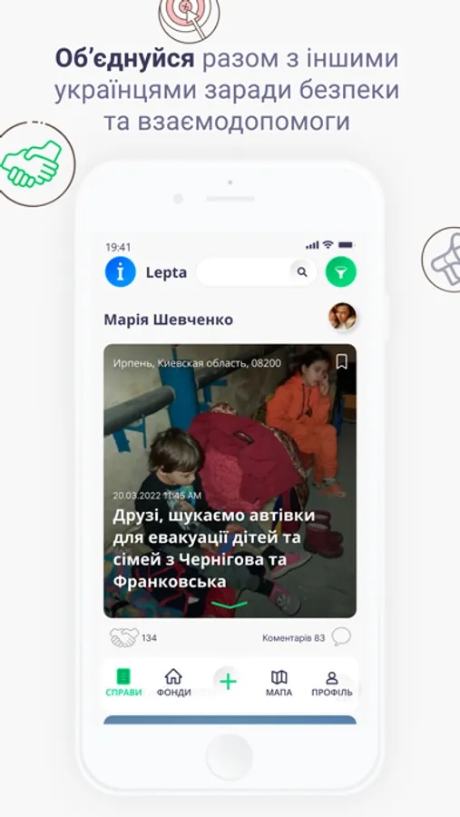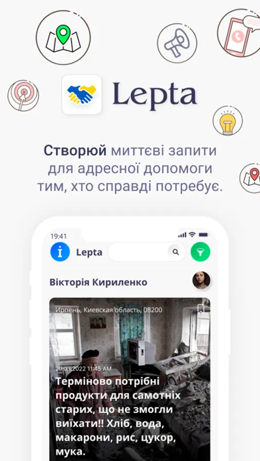 LEPTA - мобільний застосунок для iOS, створений для максимально швидкої та ефективної взаємодії та взаємодопомоги між громадянами України в умовах війни.