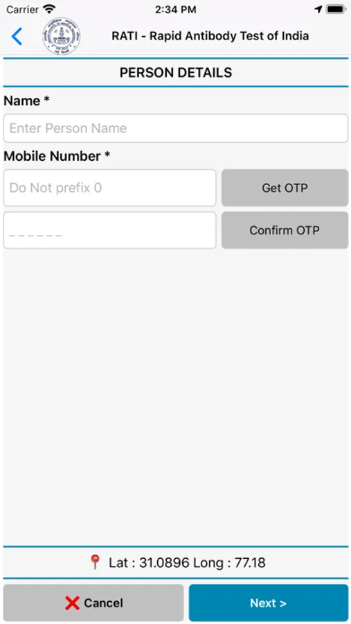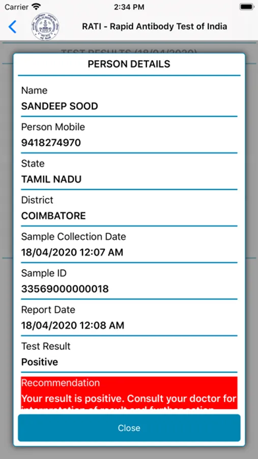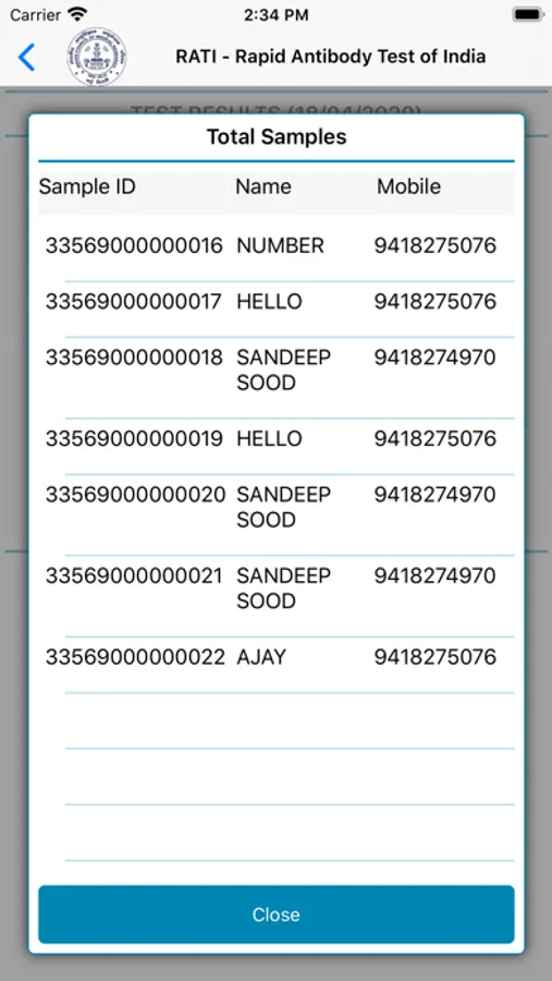 The mobile app can be used by only registered technicians only. Once the test result is ready, the technicians will also update the test results using the app. Any person undergoing for the test again has to be entered using the Repeat test option whichi will also save the entry of person's details.