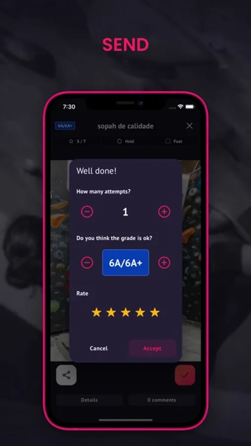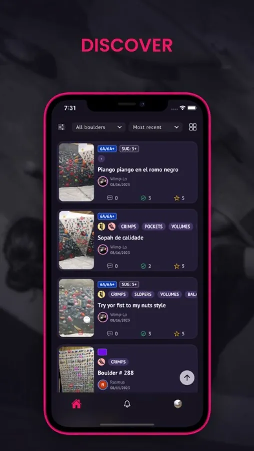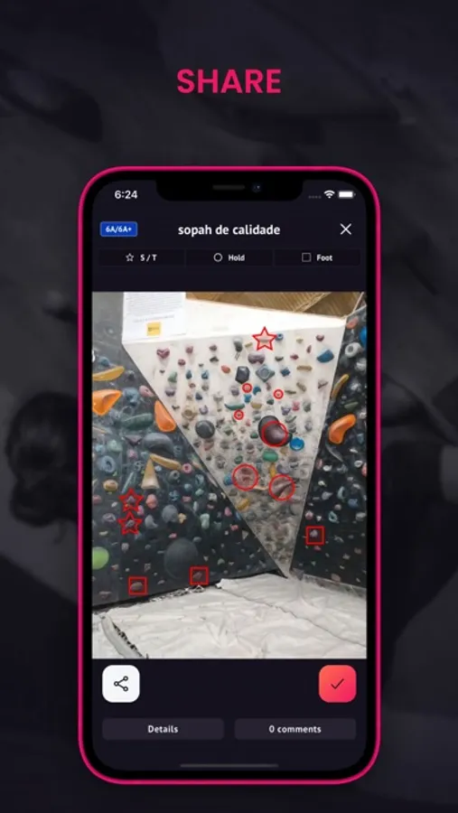 Training is more fun now!!! You just have to take a photo of the wall where the boulder you created is located, mark the holds and graduate it. Then just by saving it, it will be added to the list of problems on that wall and voila ... we can all enjoy it.