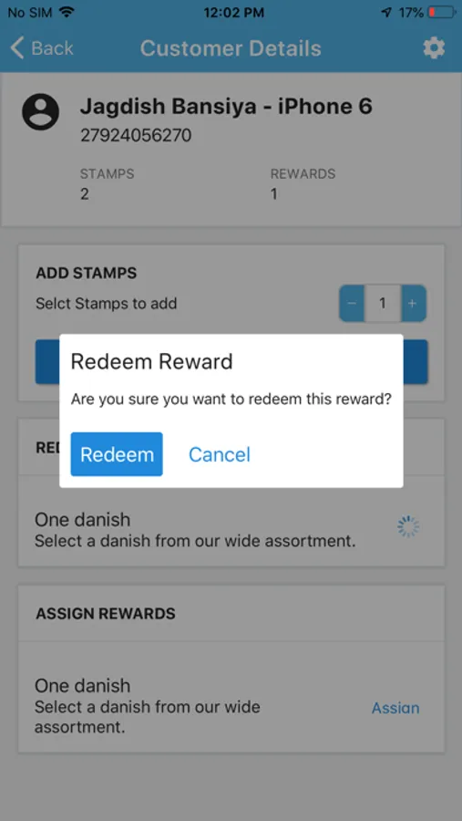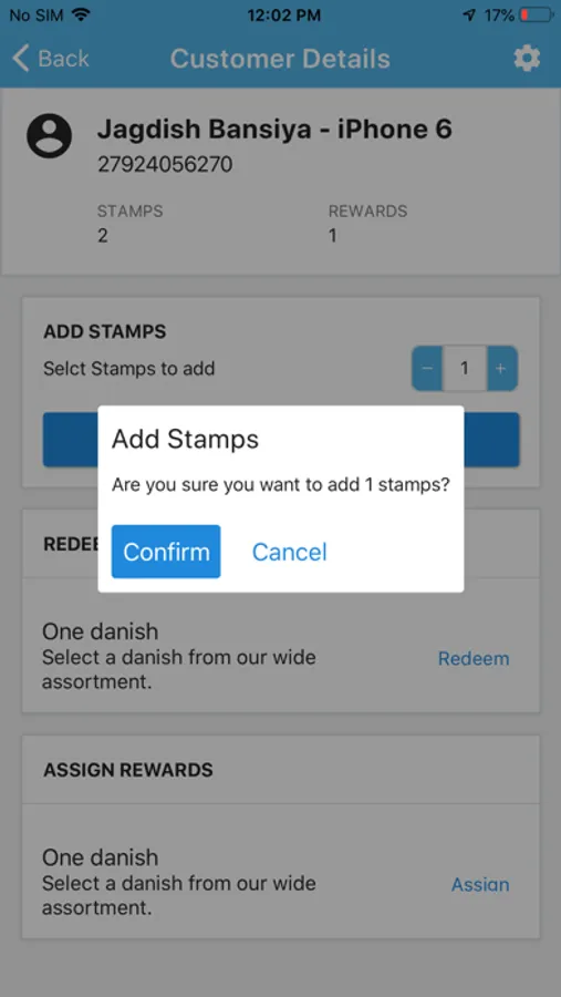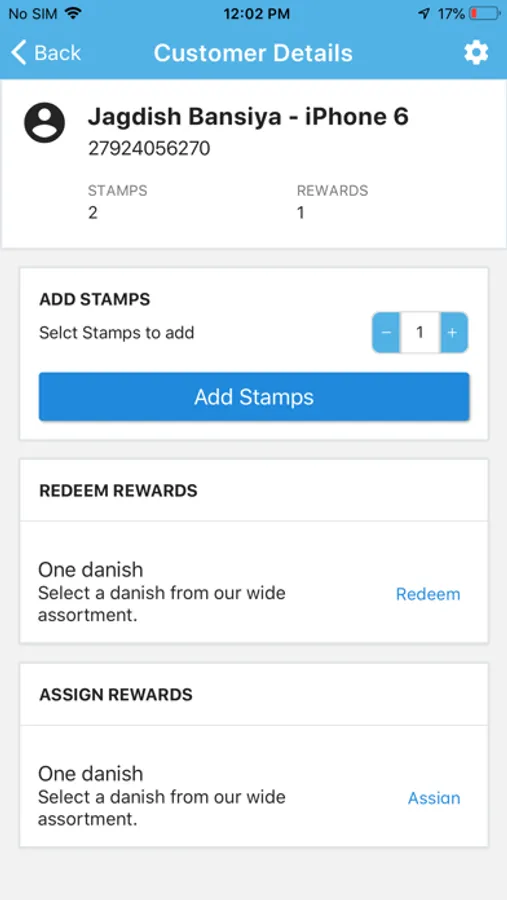 - The customer detail screen shows rewards summary (stamp count, points available, rewards earned)