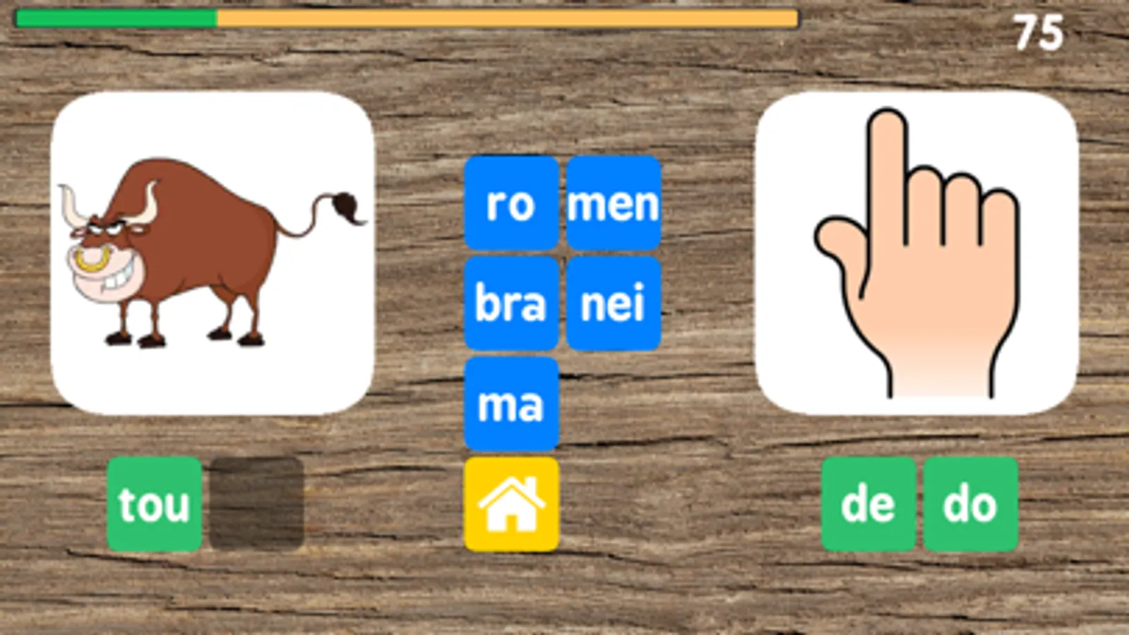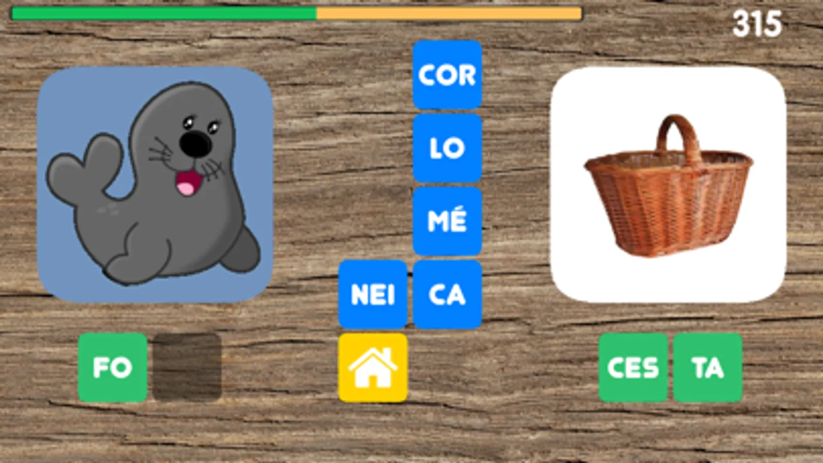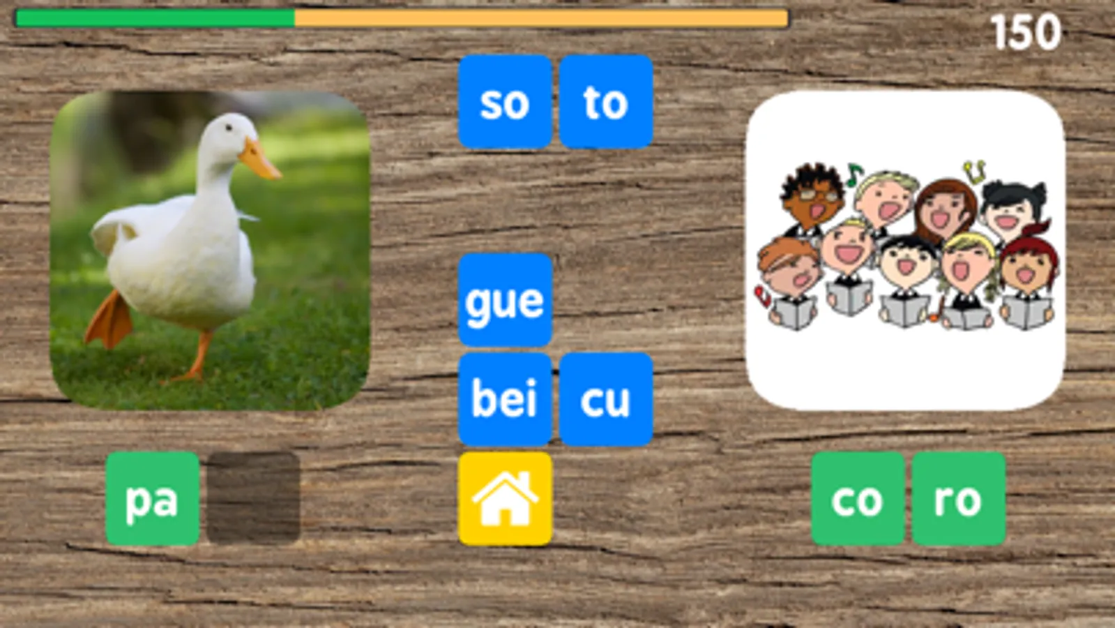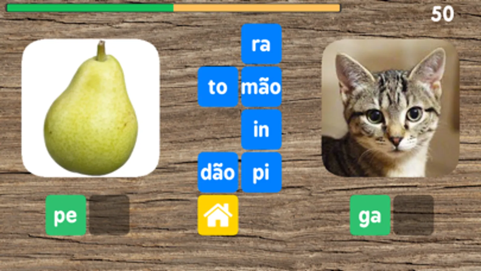 Um jogo para aprender a escrever com as sílabas da língua portoguesa. São apresentadas duas imagens de palavras portoguesas compostas por duas sílabas. O jogo é escolher as sílabas certas para escrever as duas palavras. Quando todas as sílabas certas forem selecionadas, o jogo recomeça com duas novas palavras.