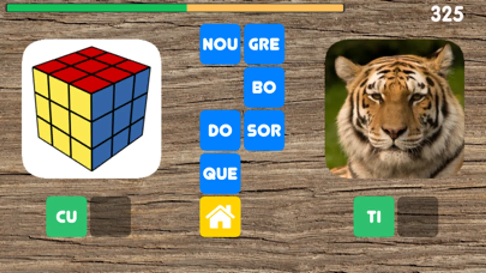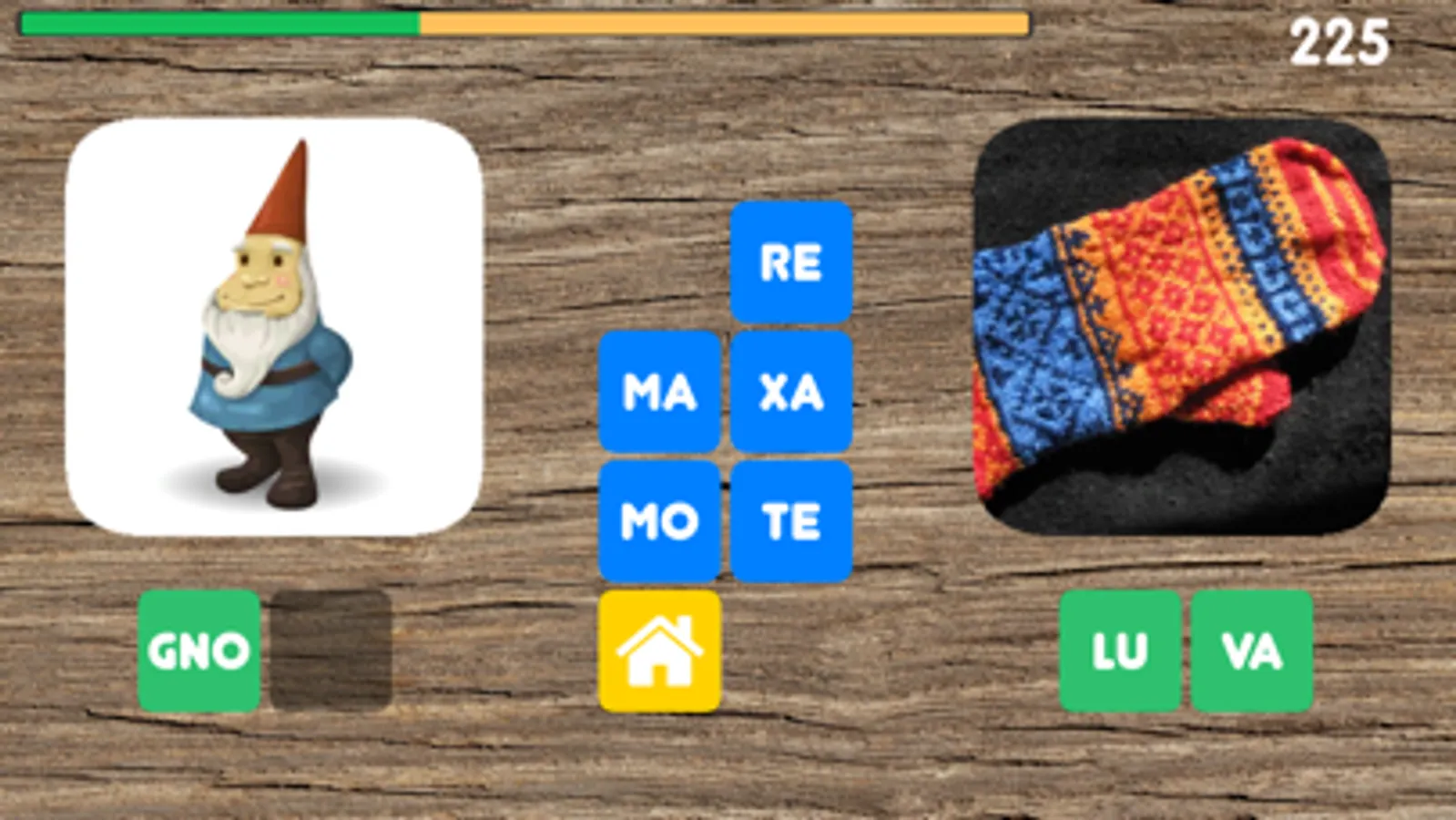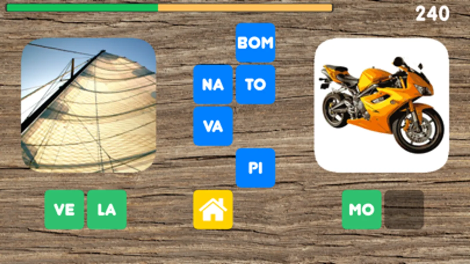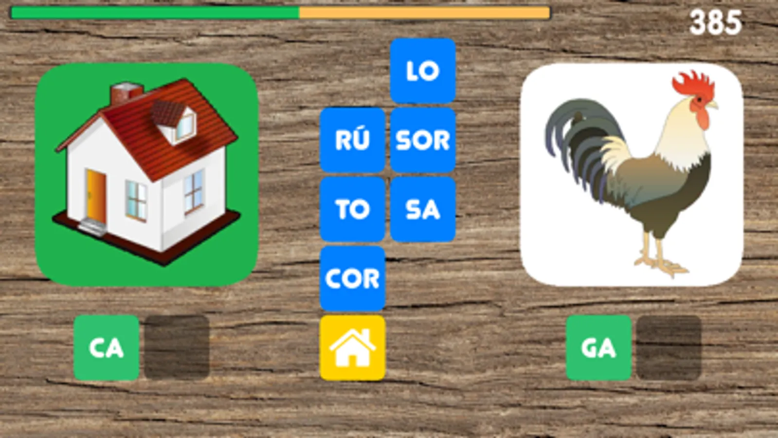 Um jogo para aprender a escrever com as sílabas da língua portoguesa. São apresentadas duas imagens de palavras portoguesas compostas por duas sílabas. O jogo é escolher as sílabas certas para escrever as duas palavras. Quando todas as sílabas certas forem selecionadas, o jogo recomeça com duas novas palavras.