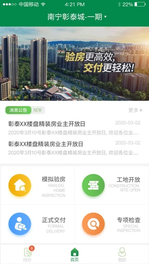 彰泰移动验房APP,是彰泰集团倾力打造的移动验房工具,涵盖了专项检查,内部验房,工地日开放,正式交代,承建商问题整改等多个应用场景,可以高效帮助企业快速交付,提高业主满意度