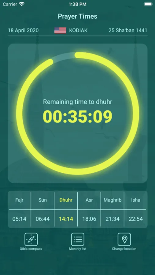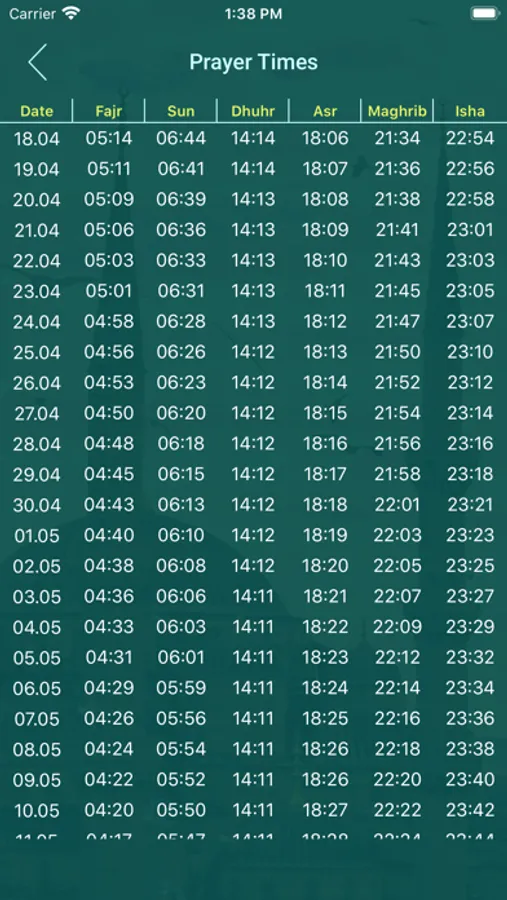 See the prayer times for Fajr, Sun, Dhuhr, Asr, Maghrib, Isha