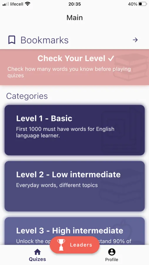 Don't forget to take a small 'Check your level' quiz! You will test your current vocabulary size, so you can better understand how many words you still need to learn!