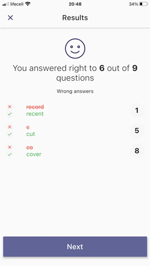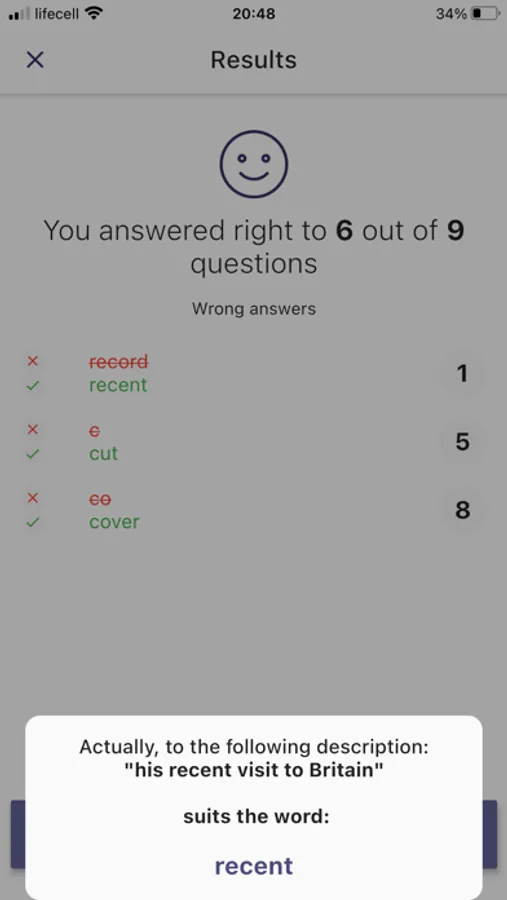- At the end of each quiz/trivia you will see the number of right answers and a list of wrong ones.