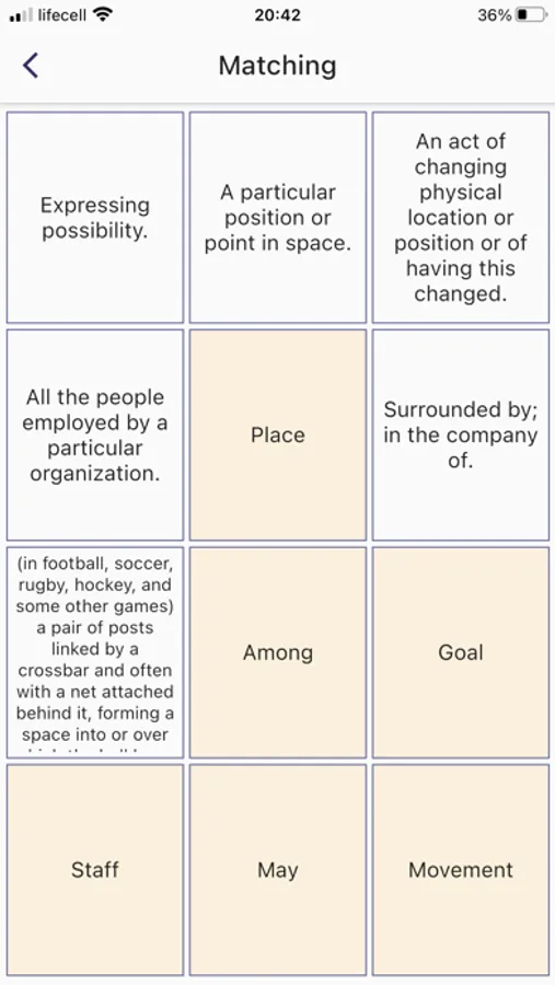 Here you need to correspond the English word with its description or a usage example. Just drag-and-drop the word tile over the description tile to check, whether you are right.