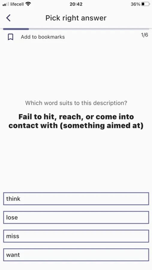 In this trivia, you need to figure out which word suits the given English description. Usually, you need to pick 1 right answer out of 4 possible ones.