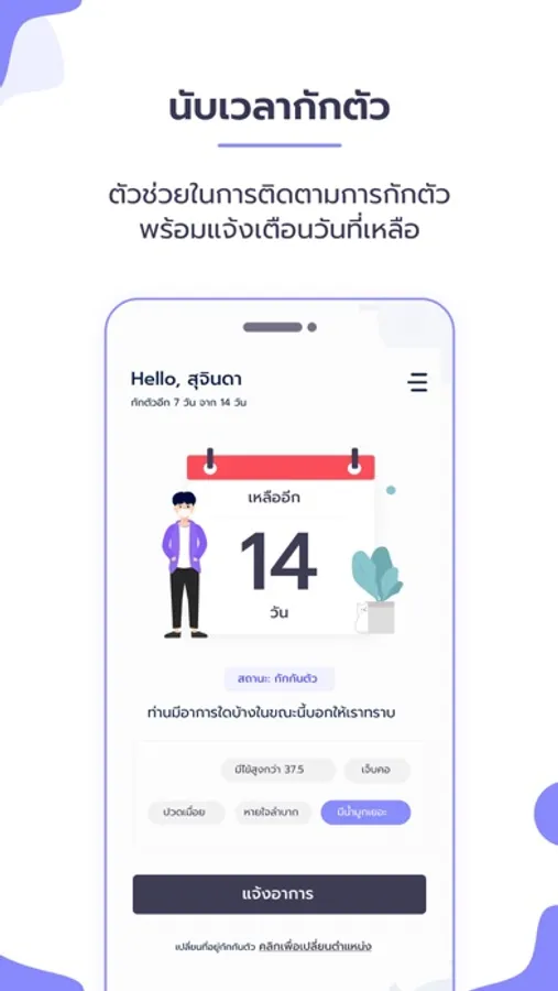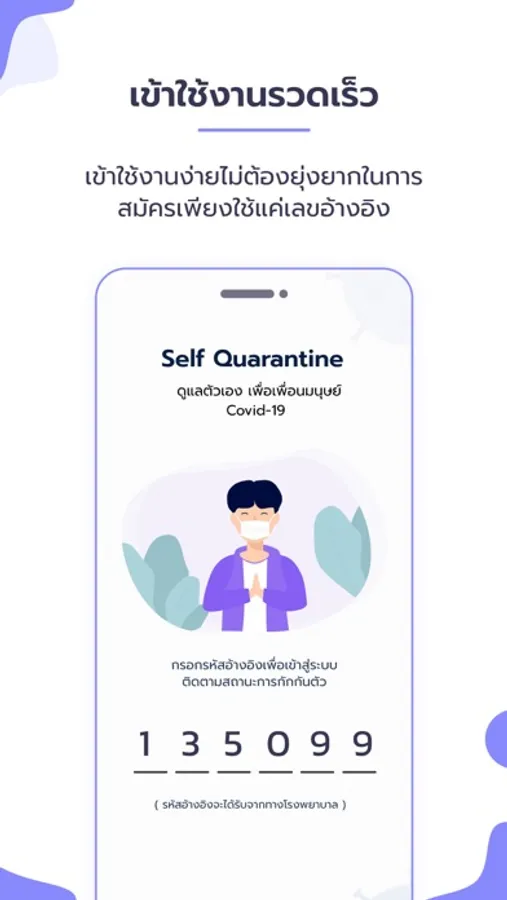 Self Quarantine is an application for monitoring people who already undergone COVID-19 from hospital and need to do self-quarantine for 14 days. User has to report symptom daily in order to let monitoring team at hospital know if any severe symptom occurs to that particular user. The information collected by the application will be used by Central Chest Institute of Thailand (CCIT) and authorized organization for purposes of screening, monitoring, treatment and COVID-19 control. The data collected will not be released to the public in a way that can identify an identity of a user.