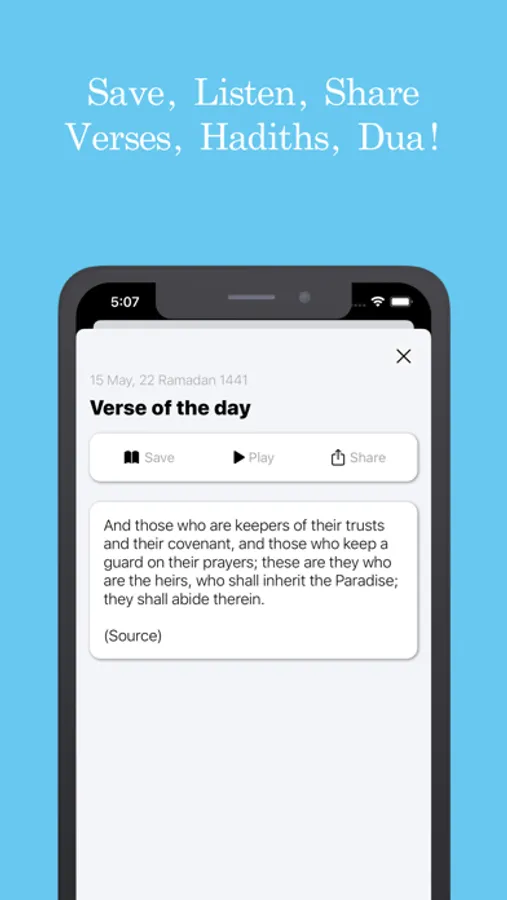 - You can listen, share and record all the verses, hadiths and prayers out loud!