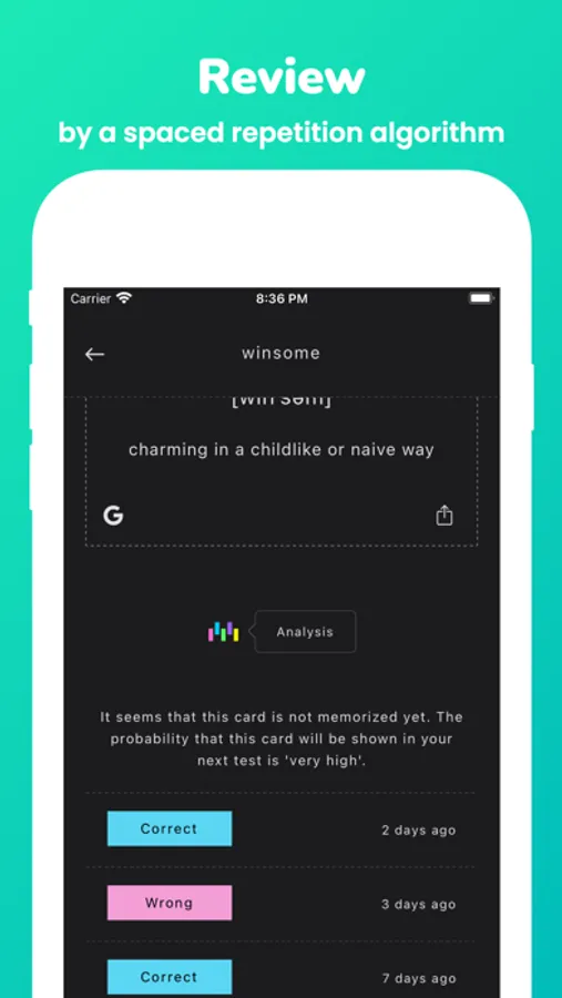 -And this scientific algorithm reminds you at the proper time to review words so that you will never forget.