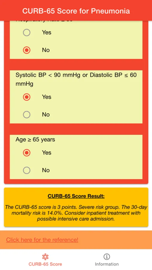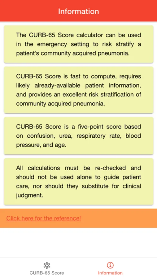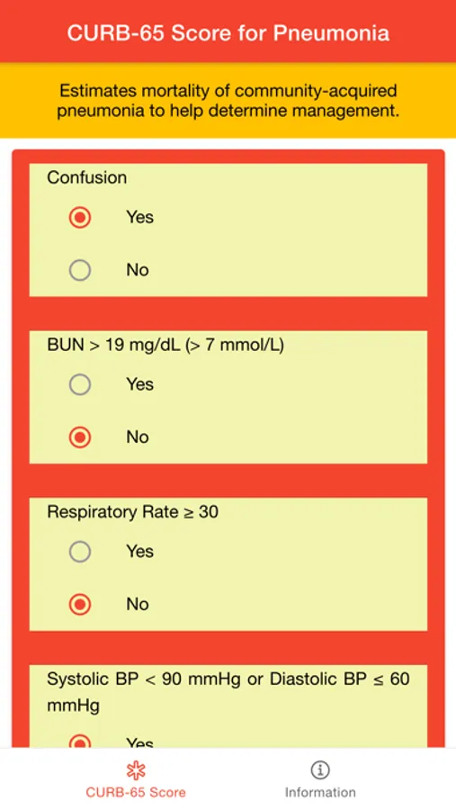 CURB-65 Score for Pneumonia is a medical app designed to help medical practitioner to estimates 30-day mortality risk of community-acquired pneumonia (CAP) so they can decide inpatient vs. outpatient treatment. CURB-65, also known as the CURB criteria, is a clinical prediction rule that has been validated for predicting mortality in community-acquired pneumonia (CAP) and infection of any site. The score is an acronym for each of the risk factors measured. Each risk factor scores one point, for a maximum score of 5: