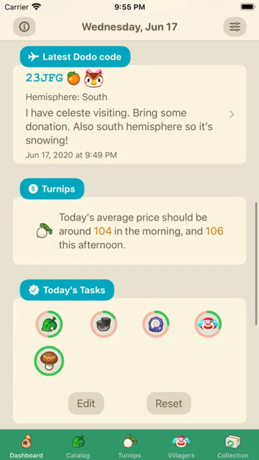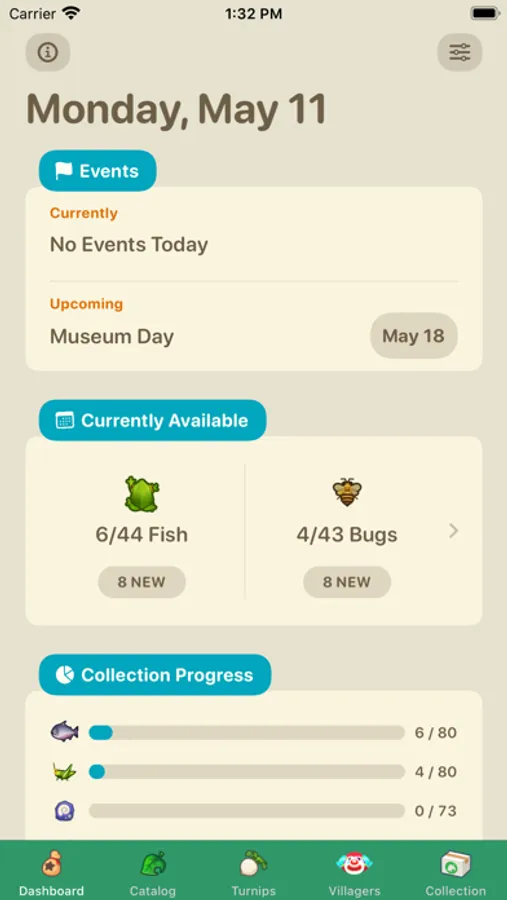 - Dashboard updated daily with ongoing events on your islands, your collection progress, villager birthday, turnips predictions and many more!