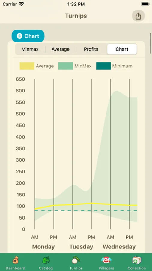 And above all, you'll find a turnips prices predictions built in! You can also have push notifications at 8 am and 12 to get the latest average prices prediction for your in game store. And we also display an awesome charts and profits estimate.